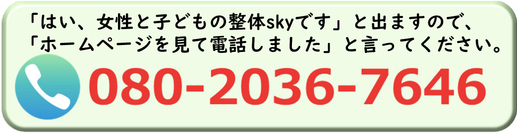 ※施術中は電話に出れませんので、留守電にお名前・電話番号を入れておいてください。ご予約は℡ 080-2036-7646 まで。メール予約は24時間受付